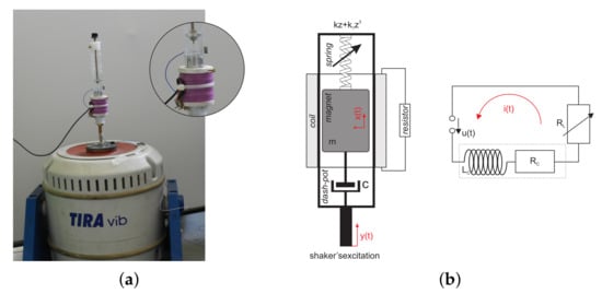 Figure 1a shows photo of the nonlinear electromagnetic harvester proposed in this paper. It is mainly composed of two fixed magnets mounted in the plexiglass tube ends, a freely moving cylindrical magnet and an induction coil. A floating magnet is suspended through the magnetic repelling force. The design allows the levitating magnet to effectively oscillate in the coil. The harvester system is mounted in the shaker TIRA and connected to the data acquisition system. To reduce the mechanical friction between the tube and magnet, a Teflon surface and air holes are applied. The magnets are arranged with opposite polarities introducing hardening-type nonlinearity into the system. Moreover, this design causes the response of the system to be wider than a linear resonant system under harmonic excitation. The detailed description of the electromagnetic levitation harvester and identification of the magnetic suspension model in papers [,] are presented.