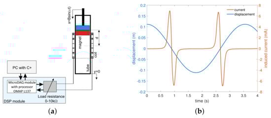 Methodology of the dynamic magnet coil test. (a) Scheme of the dynamic test. (b) The two cycles of the dynamic test of the magnet moving through the coil with harmonic excitation; the exemplary measured current (red line) and the magnet’s displacement (blue line) were obtained for frequency = 1.7698 rad/s and amplitude B = 0.11 m.