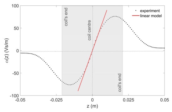 where the parameter means the slope of the red line. As we can see in Figure 3, the proposed EC model is convergent with the experimental data if the magnet oscillates in the coil center and the magnet’s amplitude does not exceed 0.01 m. For higher oscillation, a nonlinear model is proposed in the next section.