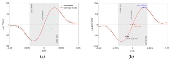 Nonlinear electromechanical coupling model (a) compared with the experiment; (b) model including the magnet’s position in the coil. The black dots mean the experimental result, while the red line is the proposed nonlinear EC model. This model can be used for all ranges of the magnet motion and its different positions in a coil (parameter d). The highest value of parameter occurs close to the coil’s end.