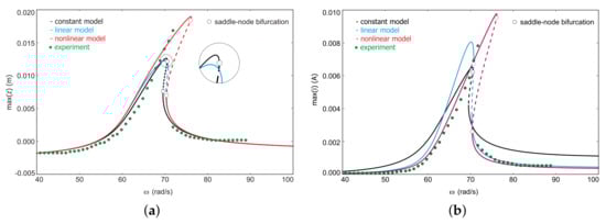 From both graphs, it can be seen that for all EC models the resonance occurs in the same place and the hardening effect is observed. The magnet’s oscillations of the harvester for all EC models are practically similar up to the frequency of 65 rad/s and above 77 rad/s. However, the recovered current differs in the whole range of frequencies. As reported in [], the constant value of the EC can be accepted but must be very accurately estimated.