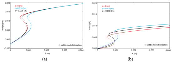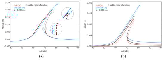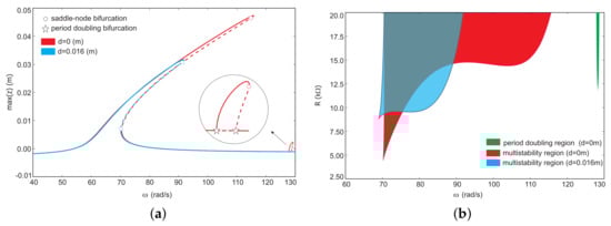 By analyzing the results in Figure 13a we can conclude that the multistability can be expanded from 70.5–76.5 rad/s for d = 0 m to 68–82 rad/s for d = −0.02 m. This means that we can easily extend the hardening effect and increase the amount of harvested energy. The blue region is symmetric and slightly shifted towards the negative values of parameter d due to the influence of gravity.