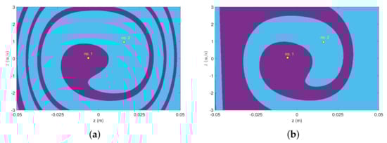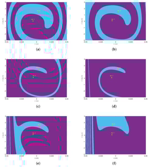 In these figures, the purple area represents the stable solution for the bottom branch (low energy output), while the blue area is for the top branch (high energy input). The attractors are marked by yellow dots and numbered 1 (for purple basins of attraction) and 2 (for blue basins of attraction). One can easily see that the basins represented by the blue color (high energy output) decrease if the position of the magnet moves away from the center of the coil. Then the low energy output (purple color) becomes dominant. For the magnet position d = 0 m, the probability of the high energy output equals 42 for d = −0.008 m the probability decreases to 36%, for d = 0.012 m the probability reduces to 10% and for d = 0.016 m the probability is the lowest 6%. Moreover, the probability of a high solution also increases just behind the coil (see Figure 7e,f).