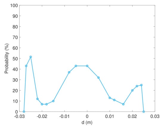 To gain a better insight into the high energy output solutions, the probability versus parameter d was calculated (Figure 8). The higher probability of solution no. 2 occurs close to d = −0.025 m and in the vicinity of d = 0 m. Interestingly, this relationship is not symmetric. This is probably caused by the gravitational force and the nonlinearity of the system.