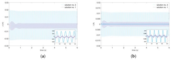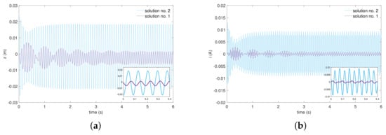 Figure 9 and Figure 10 show the exemplary time histories of the magnet oscillation and the induced current close to the coil center (Figure 9a,b) and close to the coil’s end (Figure 10a,b). The purple color indicates the solution from the bottom branch, while the blue line shows the time response from the top branch. These solutions correspond to the attractors no. 1 and no. 2 from Figure 6, respectively.