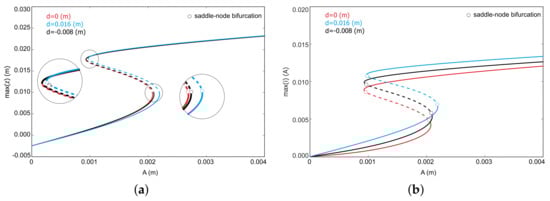 As pointed out in Section 4.1, the magnet coil configuration may significantly modify the shape of the resonance curves and hysteresis effects. The bifurcation diagrams were made by a one–parameter and two–parameter continuation methods. Figure 11a,b show the bifurcation diagrams, depicted in , A) and (, A) space, for various parameters d and the frequency of excitation of = 70 rad/s. In these figures, the region with two stable solutions (continuous lines) and one unstable solution (dashed lines) are observed. When the magnet coil displacement is relatively small (d = 0 m), the multistability phenomenon occurs in the range of 0.00054–0.00092 m, for d = −0.008 m the multistability is observed for 0.00064–0.00095 m and for d = 0.016 m multistability is located for 0.00094–0.00114 m. Note that the magnet oscillations are practically the same outside the multistability area (Figure 11a). However, the bifurcation analysis shows that the recovered current differs in the total resonance region (Figure 11b). The loss of stability is caused by SNB points (circle points).