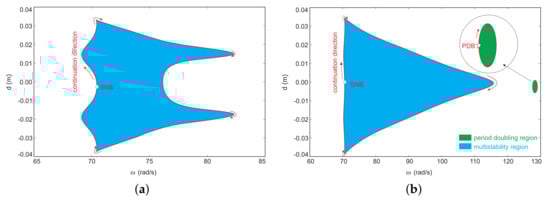 Next, two–parameter continuation bifurcation diagrams obtained for the total resistance of R = 10 k (Figure 13a) and R = 20 k (Figure 13b) are presented. These diagrams are obtained when two parameters change simultaneously. In our case, the parameter d and frequency of excitation were chosen as varying. The numerical continuation starts from the SNB point for d = 0 m. The arrow shows the direction of the numerical continuation. The red line shows the subsequent locations of the SNB points in each step of simulation. The blue area shows the multistability region with two stable and one unstable solution(s).