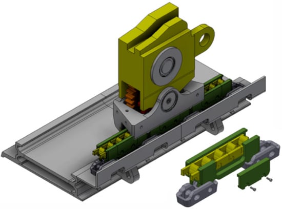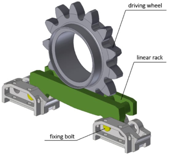 The stringless haulage mechanism with two driving wheels known as Eicotrack 2 BP, the model of which is shown in Figure 1 [,,], is the most commonly used system in underground coal mines. In this system, the shearer is moved due to the cooperation of track wheels, located vertically in the shearer movers, with the Eicotrack linear rack installed horizontally in the spill-plate. The linear rack segment used in this system consists of two longitudinal bars, inseparably connected with six pins, creating a rigid body.