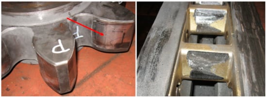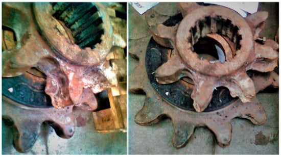 During operation, the adjacent conveyor troughs move in the horizontal and vertical planes one against the other. Rigid fastening of rack segments to the spill-plates supports makes their movement impossible, especially in the horizontal plane, which causes the rack position to change in relation to the track wheel when the route of the AFC (armored face conveyor) is bent. This leads, on the one hand, to a disturbance of the pitch between the end pins of adjacent linear racks and to a change in the distance between the pins of the rack segments and the axis of rotation of the track wheel, and on the other hand, to the so-called teeth edging [,,,,,,,,]. Unfavorable excesses of dynamic forces causing increased wear of the roadheader track wheel are a result of the above-mentioned route disturbance. In turn, as a result of the so-called teeth edging, the pressing stresses between the cooperating surfaces of the track wheel and rack are significantly exceeded, which also leads to excessive wear of the shearers’ track wheels. These phenomena are intensified along with the increasing power of movers and the weight of longwall shearers []. This is the reason for numerous downtimes during the longwall mining, leading to large losses due to the need to replace worn-out components in particularly dangerous conditions []. The view of damaged track wheels requiring replacement is shown in the Figure 2. In comparison to the new one, the dimensions of the teeth are up to 50% decreased.