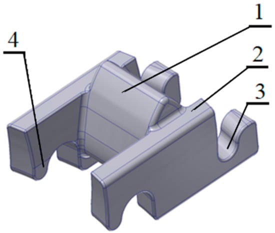 3D model of a rack segment: 1—tooth, 2—side wall, 3—socket, 4—catch.