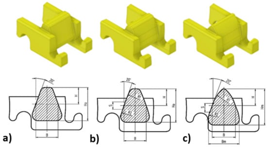 Considering the above information and the results of work with the Flextrack haulage system, three new design solutions for rack segments were developed for the simulation tests, Figure 9. The basic rack for involute intermeshing, i.e., a rack with straight teeth, is presented as Type V1 in Figure 9a. The following are racks with modified profiles. A segment with a tooth with a mixed arch profile Type V2 is shown in Figure 9b, and Type V3 in Figure 9c is a segment with a modified tooth profile, used in liner racks for the Eicotrack system manufactured by Ryfama.