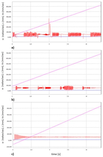 The results of simulation tests carried out in accordance with the suggested methodology in Autodesk Inventor-Dynamic Analysis Environment are shown in Figure 10. Three kinematic parameters, such as the angular speed of the frame wheel ω, assumed to be a constant (kinematic motion excitation), the displacement L of the model of the wheel drive, and the linear speed of this displacement Vs, are shown in graphs.