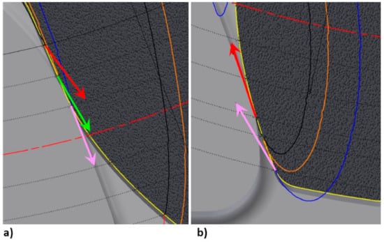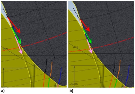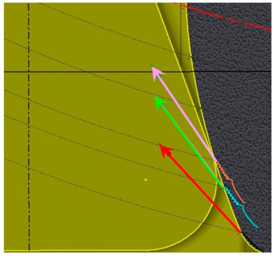 Regardless of the analysis of the impact of gear ratio disturbances, the result of which showed a significant improvement in the cooperation of the wheel with the rack by modifying the teeth geometry, the trajectory and speed of movement of the wheel tooth tips was also analyzed, enabling directly assessing the slip speed. Comparative analysis was also carried out regarding the tooth profile in the currently used Eicotrack rack system to verify the advisability of modifying the tooth profile of the rack. The parameters were determined in the same way as for the tests of racks suggested for the KOMTRACK system. The selected results of this analysis as screen shots are presented in Figure 11, Figure 12, Figure 13, Figure 14 and Figure 15, successively for each KOMTRACK rack segment and Eicotrack linear rack. The arrows show the values (length of the arrow) and directions of the slip speed for successive positions of the track wheel in relation to the rack—the first position is marked in red, the next in green, and the last in pink.