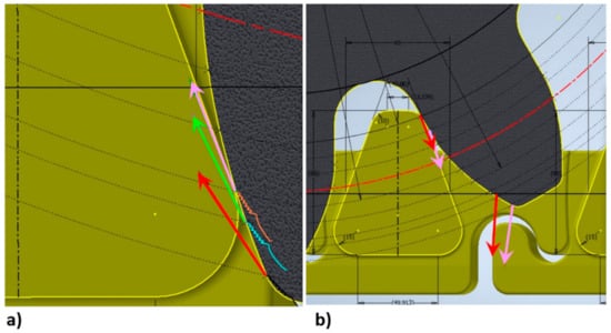 Complex rolling and sliding processes are found between the two involute sections in the buttress, in the result of different lengths of the cooperating involute sections. These sections responsible for the uniform rotations of the cooperating wheels can be regarded approximately as circular arcs, the radii of which are equal to the radii of curvature at the considered places. According to the diagram in Figure 8a, the slip speed vp at point B will be []:
