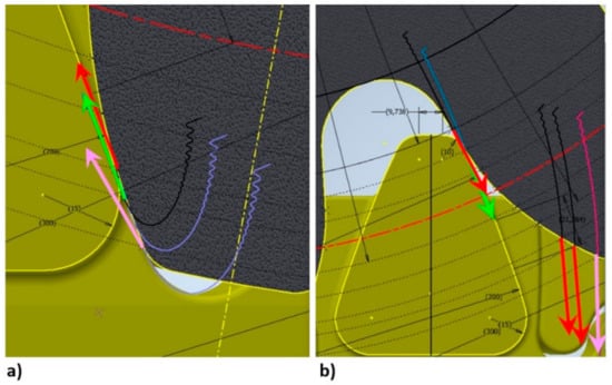Toothed segment Type V3: (a) slip of the track wheel surface when entering the buttress with a rack for a point significantly far from the cut, slip speed at the moment of contact, about 11.6 mm/s, (b) contact point moves along the rack surface, slip speed reduces to about 9.0 mm/s.