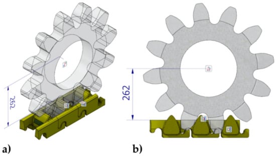Later, the cooperation of the selected kinematic pair, the track wheel and the Type V3 gear segments, was analyzed in the Autodesk Inventor, AutoCAD Mechanical, and Microsoft Excel software environment in terms of slippage during the total rolling of the wheel through the toothed segment. Simplified 3D models of Type V3 toothed segments without casting beams and a simplified 3D model of a track wheel of a nominal width 76 mm was used for the analysis. For this type of analysis, only the profiles of the tooth flanks of the cooperating kinematic pairs are important. The entire length of the contact between the kinematic pair was analyzed, which translates into the angle of rotation of the track wheel by 30°. This angle results from the number of teeth on the frame wheel z = 12. After rotating the track wheel by 30°, the intermeshing conditions are repeated cyclically. The gear axis is 262 mm from the upper surface of the sidewalls of the gear segments. The general isometric view and the cross-section of the track wheel connection with toothed segments developed to analyze slips in the kinematic pair of the KOMTRACK feed system is shown in Figure 16.