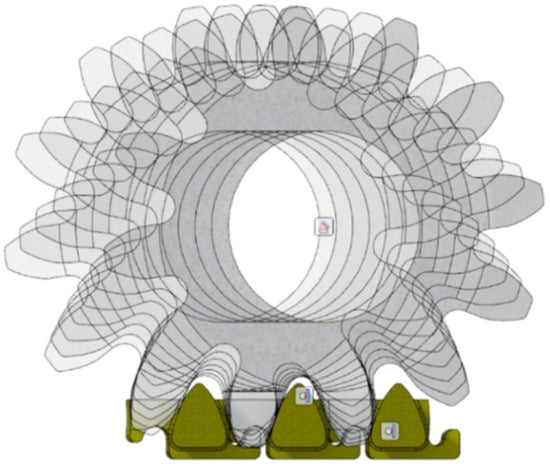 The analysis began with intermeshing at the moment when two teeth of the track wheel were in contact with two teeth of neighboring toothed segments. This intermeshing of the kinematic pair was taken as the beginning of the meshing and a track wheel rotation angle of 0° was assigned to it. Then the track wheel was rotated by 1° with the simultaneous contact of the corresponding tooth surfaces. Successive rotations of the track wheel by an angular increment of 1° were repeated until the wheel rotation by 30° was achieved. A view of the analyzed positions of the track wheel for the selected angular positions 0°, 5°, 10°, 15°, 20°, 25°, and 30° in relation to the toothed segments is given in Figure 17.