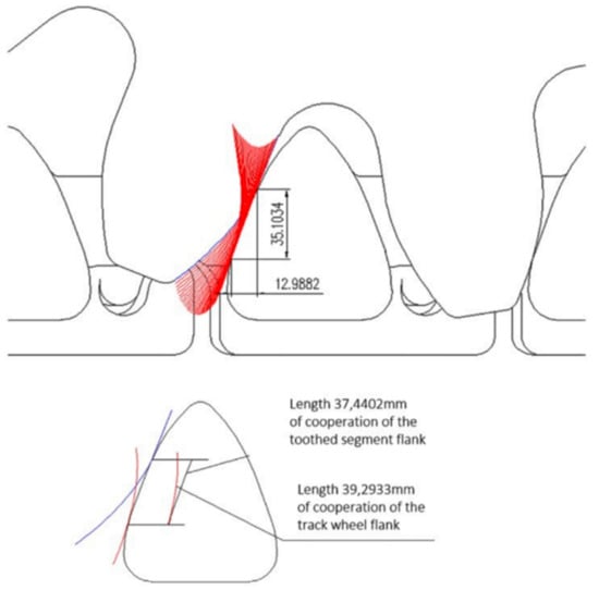 Figure 18 shows the results of the analysis of slippage of the track wheel flank in relation to the toothed segment flank. The study shows that starting from the moment of intermeshing, the slip of the toothed segment flank in relation to the track wheel flank increases, reaching a maximum value of about 8 mm in the middle of the intermeshing length (angle of rotation of the track wheel about 15°). Thereafter, the slip of the toothed segment flank decreases until it reaches a non-slip condition corresponding to a track wheel rotation angle of approximately 28°. From this moment until the gearing out, the flank of the track wheel begins to “accelerate” in relation to the flank of the toothed segment—slippage of the analyzed kinematic pair results from the differences in the active length of the cooperating teeth. The active length of the track wheel flank is approximately 39.3 mm, while the corresponding length of the toothed segment flank is less than 37.5 mm. The identified differences in the active length of the two buttress surfaces are one of the main causes of the frictional wear of the shearer’s haulage system components. Based on the determined slip, a diagram was drawn up (Figure 19), illustrating the changes depending on the track wheel angle of rotation.