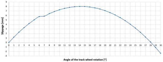 Diagram of the kinematic pair—track wheel-Type V3 toothed segment slippage in a function of the track wheel rotation angle.