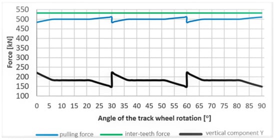 Diagram of changes in the following forces: pulling force, inter-teeth force, and vertical component Y in a function of track wheel rotation angle.