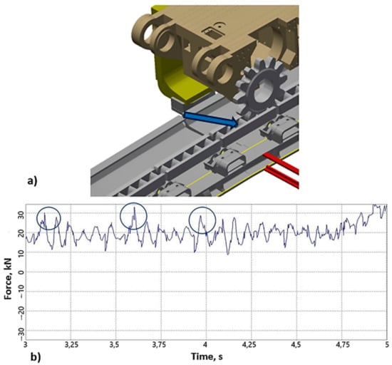 Simulation tests of the displacement along the conveyor section twisted in the horizontal plane were performed first for the Eicotrack system. The displacement started with the shearer travelling along a straight section, followed by a displacement through linear racks twisted in relation to each other. The shearer’s travel was simulated until the conveyor troughs were twisted by an angle of 2.5°. During the displacement, the following assumed cooperation parameters were measured: the track wheel–linear rack, i.e., reactions in the selected kinematic nodes and contact forces. Identification of the contact force of the frame track and linear rack was the most important for analysis. A view of the model with the Eicotrack system used for the tests with the linear rack, along which the parameters were measured, is shown in Figure 23a. The resultant contact force is shown in Figure 23b. The circles mark the force peaks related to full contact of the track wheel and the rack.