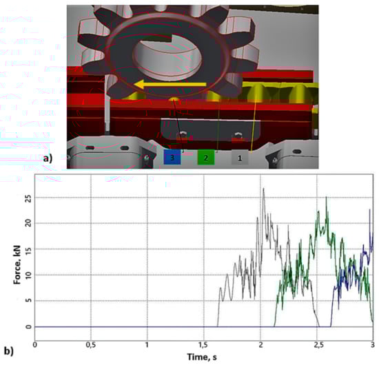The next stage of the tests was the analysis of the KOMTRACK system. The methodology of testing in this case was the same as for the Eicotrack system. A sample view of the 3D model of the shearer used during the tests is shown in Figure 24a. An upgraded toothed segment model without catches was used for testing. During the tests, the contact forces were recorded in three central toothed segments located in the guide twisted at an angle of 2.5°. The contact forces related to the selected toothed segments measured during the tests are shown in Figure 24b.