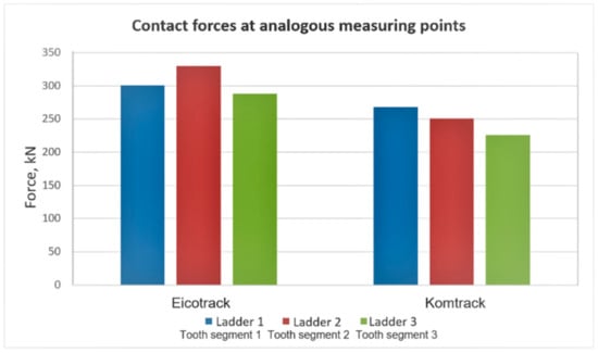 Diagram of the maximum contact forces (for the three middle components of linear racks/toothed segments) for the Eicotrack and KOMTRACK systems.