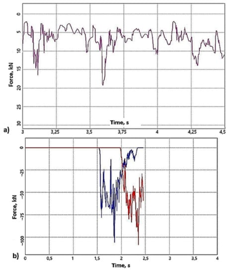 The parameters of the vertical component of contact forces at the point of contact: (a) track wheels—Eicotrack system linear rack, (b) track wheels—modernized KOMTRACK system: toothed segment 1—red color, toothed segment 2—blue color.