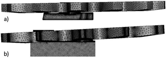 At the moment of contact of the track wheel with the Eicotrack linear rack or KOMTRACK toothed segment, the angular deviation of the track wheel plane was measured in relation to the symmetry plane of the liner rack or toothed segment. The deviations of the plane of the discretized model of the track wheel with respect to the symmetry plane of the KOMTRACK toothed segment and in relation to the symmetry plane of the Eicotrack linear rack are shown in Figure 28a and Figure 28b, respectively.