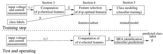 From the values of a set of features describing a unique HEA signature, we aim at identifying the closest pre-registered HEA, referred to (according to the machine learning literature) as a class. To this end, we use a supervised machine learning framework trained on an annotated dataset. The overall HEAs’ recognition problem can be illustrated in the flowchart of Figure 1, which also includes references to the paper sections where each method is detailed. During the training step, several features (or descriptors) deduced from voltage and current HEAs’ measurements are first computed and used to derive a discriminative model for each HEA. Then, the most discriminant features are automatically selected to obtain the optimal classification accuracy. During the test and operating procedures, the selected features are computed from the observed measurements to predict the class of the corresponding HEA.