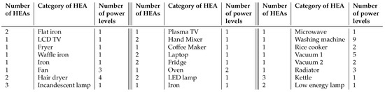 We introduce a novel publicly availabledataset containing 24 categories of HEAs (e.g., fans, fridges, washers, etc.) considered with distinct brands (35 types) and that were recorded at several power levels to lead us to a total of 61 considered HEAs. For HEAs with a wide variety of operational programs or adjustable settings such as temperature or intensity, we recorded all power consumption patterns and considered that an HEA power level corresponds to a specific class of HEA, although power consumption patterns refer to the same device. Figure 2 lists the considered categories of HEAs.