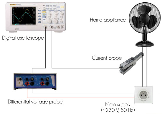 The HEAs have been recorded in steady-state conditions in a French 50 Hz electrical grid. The measurement setup consists of an AC current probe (E3N Chauvin Arnoux) with a 10 mV/A sensitivity and a differential voltage probe with a 1/100 attenuation. Voltage and current waveforms were captured by an 8-bit resolution digital oscilloscope (RIGOL DS1104Z). The sampling rate was set at kHz for some of the recordings and kHz for the other part. Electrical assembly and instrumentation are depicted in Figure 3. Hence, each HEA of this dataset is described by 8 periods of the current and voltage steady-state waveforms, resulting consequently in a set of distinct individuals.