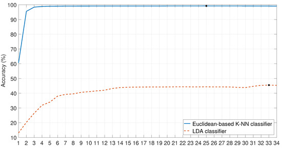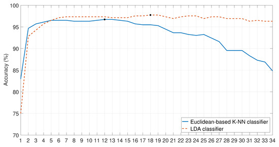 - For the sequential forward FS method, our experiments compare the results provided by the Euclidean-based KNN classifier (where the neighborhood parameter is set to ) and to the LDA classifier. The number of nearest neighbors is set to 7 because it is the closest odd number to the number of instances in a class in the proposed dataset, so that for each neighborhood, there is a majority vote. The selected features are those that reach the maximum accuracy [47] reported in Table 2 and Table 3. For our dataset, only 12 features allow maximizing the KNN classifier accuracy and 18 features maximize the accuracy of the LDA classifier (see Figure 5). For the PLAID dataset, 25 features allow maximizing the KNN classifier accuracy and 33 features maximize the LDA classifier accuracy (see Figure 6). The low accuracy reached by the LDA classifier in the PLAID dataset can be explained by the unbalanced training sets (where one or several classes outnumber the other classes) [48]. Indeed, LDA is known to not provide good performances in this setting since classification is generally biased towards the majority classes. It is observed that for the LDA classifier, the accuracies less rapidly reach a plateau than for the KNN. Indeed, the KNN is known to be affected by the overfitting phenomenon [49,50], which increases the distance between individuals of the same class and decreases the accuracy. The classifier cannot deal with the feature relevance and is more sensitive to FS than other classifiers such as LDA, which can handle irrelevant features [51].