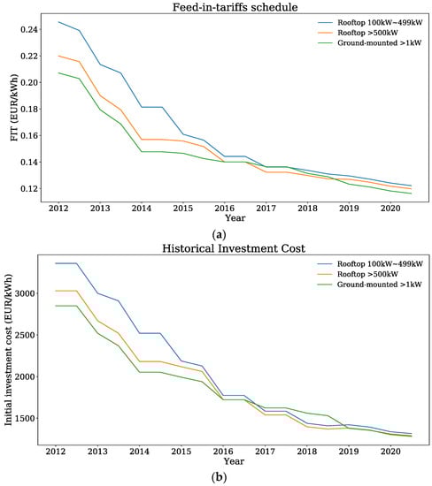 (a) FIT schedule from 2012 to 2020 (b) Investment cost from 2012 to 2020 Source: [15], self-elaboration.