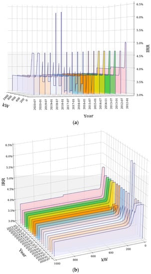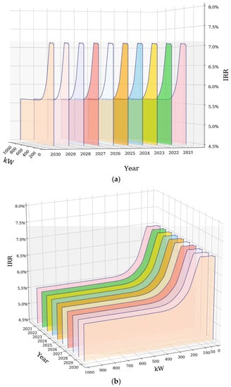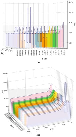 Figure 4 presents the project IRRs for rooftop PV systems (PVS) with capacity 1 to 1000 kW from 2012 to 2020, illustrated from different angles by Figure 4a,b. From Figure 4b, the smaller scales of the PV systems, the higher returns. As commented in Section 2, smaller PV systems with greater costs per kW are compensated with higher feed-in tariffs, corresponding with the long term policies. Nonetheless, it seems like the difference in returns regarding capacities is overestimated.