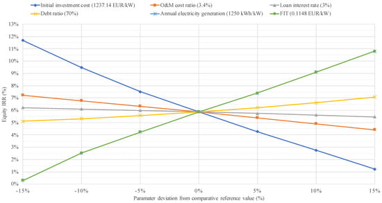 The results of sensitivity analysis for a 250 kW rooftop PVS with the contract in 2030 are presented in Figure 7. The equity IRR is largely sensitive to three parameters, which are initial investment cost, feed-in tariff and annual electricity generation. The results are the same with the sensitivity analysis in the USA and Greece [16,44,45]. Large upfront costs and incentives like feed-in tariffs may cause great impacts on the IRRs [46]. The comparative reference value of equity IRR with no changes is 5.87%. An initial investment cost lower than the reference case by 15% would generate an IRR that is higher by 5.81 points. When the feed-in tariff or annual electricity generation increases by 15%, which means that the revenue side gets 15% higher than the reference case, it would lead to an IRR that is larger by 4.92 points.