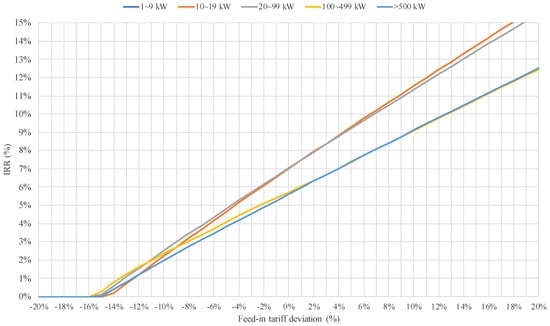 Previous results of predicted equity IRRs summarizes that medium-sized rooftop PV systems become less profitable in the next ten years. Figure 8 shows the dependence of predicted equity IRR variation on FIT deviation from the prediction of 2030. As long as the FITs do not reduce to between 1% to 4% less than current projections in 2030, the investments in PV systems are financially feasible.