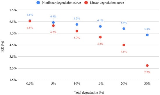 When making investment decisions, investors are more concerned about IRR. Many researchers have concluded that nonlinear and linear degradation curves may have a significant impact on the LCOE [45,47]. It may result in a difference of IRR. Table 2 shows the degradation rates of different degradation curves with different total degradations. In the nonlinear degradation case, the curve is at a stable phase, namely the degradation rate is 0, in the first 10 years, followed by a fixed degradation rate in the remaining 10 years; while in the linear degradation case, the degradation rate is fixed throughout the entire 20 years. Since the degradation period of the nonlinear case is half that of linear case, the rates of nonlinear case would then be 2 times that of linear case under the same total degradation.