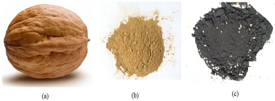 (a) The original shape of walnut (b) shell residues and (c) their respective bio-chars.
