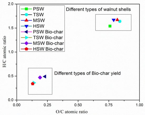 Van Krevelen diagram of different types of walnut shells and their respective bio-char yields.