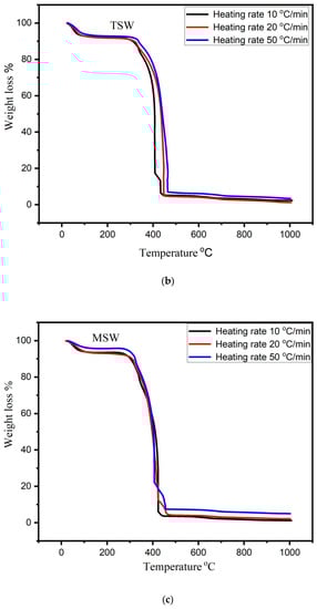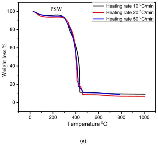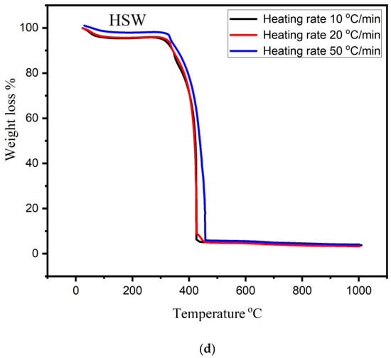 The results of TGA carried out in an oxidizing atmosphere at 10, 20, and 50 °C/min heating rates are revealed in Figure 4. The weight loss range can be classified into the three divisions. Every new slope indicates the beginning of a new stage. In the first division, about ≈2.5–7% mass loss was observed between the temperatures from 29 to 160 °C for all heating rates and for all types of bio-chars. In the first stage, the maximum mass loss seems to occur in TSW (7%) at 20 °C/min and the lowest in HSW bio-char (2.5%) at a heating rate of 50 °C/min (Figure 4b,d).The mass loss is due to the removal of moisture and sorbent water bounded by surface tension. The second zone starts at 330 °C and continued up to 475 °C where the mass loss from 75–81% at 10 °C/min, 78–89% at 20 °C/min, and 81–90% at 50 °C/min are recorded for all bio-chars. A huge weight loss of 90% for HSW at a heating rate of 50 °C/min and average weight loss of 82.5% were observed for rest of the bio-chars, see Figure 4d. In this zone the mass loss is due to the existence of cellulose and lignin contents which undergo a oxidation/devolatization reaction. The third zone starts at 475 °C and continues with almost negligible loss of mass. The decomposition of lignin takes place very slowly in the third zone as a result almost straight line is observed. The behavior of TGA analysis was found in agreement with the outcomes described in the literature [52,53,54,55,56,57].
