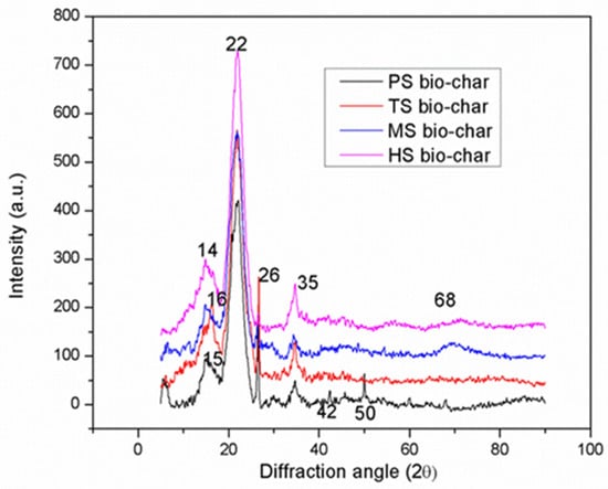 The XRD patterns of the bio-chars at a temperature of 375 °C are shown in Figure 6. The peaks are in the range of 5–900 on the base line of the diffractograms. The peaks at 14° (d-space~5.96 Å), 15° (d-space~5.7 Å), 16° (d-space~5.3 Å), 22° (d-space~4.0Å), 26° (d-spa1ce~3.34 Å) and 35° (d-space~2.5 Å) were assigned to cellulose and hemi-cellulose, respectively. Different types of bio-char samples in the diffraction angle (2θ) have a wide halo in the 2θ range from 6 to 20°, showed that chain contains large number of carbons containing components substances. The band at 2θ = 22° showed disordered structure, which occurred due to presence of aliphatic and distorted arrangement of carbon chain. Broad peak at 2θ ≈ 26° of bio-char indicated presence of silica in the X-ray diffractogram. The peak at 15 and 16° were derived from cellulose constituent. Bio-char samples showed narrow and sharp bands over the examined 2θ, due to the presence of inorganic constituents in the carbon chain. The XRD graphs confirmed the aromatic and crystallinity nature of the bio-chars, which is in agreement with other bio-chars [65,66,67].