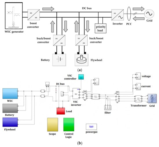 Schematic layout of the modelled system: (a) conceptual configuration and (b) Simscape/SimPowerSystems implementation.
