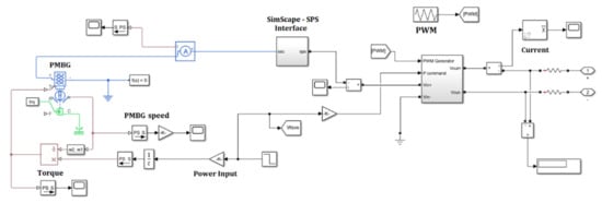 Figure 3 depicts the implemented WEC generator, modeled as Permanent Magnet DC Brushless Generator (PMBG). Since the present work is mainly focused on the electric aspects relating to the integration of HESS in a WEC, only the generator connected at the Power-Take-Off (PTO) has been taken into account. The rated power of the PMBG is equal to 250 kW with a nominal DC voltage of 400 V. The inertia momentum of the PMBG is equal to 1.33 kg·m2 and the viscous damping to 78.8 Nms. Since the PMBG block is developed in Simscape, an interface block is used to link the Simscape block to the SPS environment. Furthermore, a boost converter is used to increase the PMBG DC voltage up to the DC bus voltage (fixed at 650 V in order to interface with the 400 VL-L three-phase low voltage grid). The control of the boost converter is performed by means of Pulse Width Modulation (PWM) strategy.
