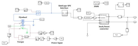 The flywheel subsystem block diagram is illustrated in Figure 5. It includes the mechanical flywheel, the PMBM electric machine, the buck/boost converter and the related control scheme. As concerns the electric machine, it is noted as in this work the design and HESS operation is focused on the energy exchanges among its components. A PMBM with a maximum power of 33 kW in relation to the torque vs. speed characteristic curve has been implemented. The power required from or supplied to the flywheel, as well as for the battery, is imposed according to the specific procedure described in Section 3 and transmitted as input to the PMBM, which has a proper internal torque control. The interface block allows enabling the interconnection between Simscape (SSC) and SPS blocks. The buck/boost converter regulates, through a PWM strategy, the electric machine input and output powers.