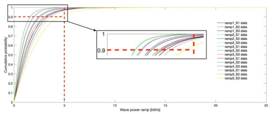 - reducing the power ramp associated to the battery in order to preserve it. Thus, more oscillating power profile is imposed to the flywheel, while a flatter profile is exchanged by the battery, all in the context of reducing the power ramp at the PCC. Our previous research proved that the proposed power management strategy achieves more than 80% ramp at the PCC compared to the original renewable energy source profile and around 70% smoothing regarding the battery profile compared to the flywheel []. The wave power ramp cumulative distribution function corresponding to the selected days in all three sites is depicted in Figure 6. It is evident that the wave power ramp values do not exceed 20 kW/s during the monitoring time span in none of the cases. Moreover, in 90% of the occurrences, the power ramp values are under 5 kW/s.