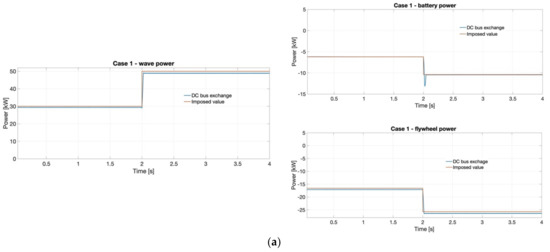 - Case 2: wave power step-down, the wave converter power drops from 50 kW to 30 kW, simulating symmetrically to Case 1 the 20 kW power step. In this case, both battery and flywheel keep their charging operating mode, but reduce the power they absorb in order to smooth the power flow at the PCC. The flywheel withdraws from the DC bus 12 kW less power and the battery reduce the absorbed power by 5 kW, as depicted in Figure 7b.