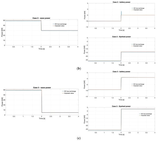 - Case 3: wave power step-down, the wave converter power drops by 90%, from 50 kW to 5 kW. This step value is taken into account as a forward stressing dynamic condition, aiming to prove that the proposed configuration and related power management are operating properly, being capable of coping with even higher fluctuations than expected. Under these circumstances, both battery and flywheel switch their operating modes to discharge, aiming to reduce the difference between the power flow at the PCC. Thus, the flywheel provides 29 kW more power, while the battery increases the delivered power by 10.2 kW, as depicted in Figure 7c.