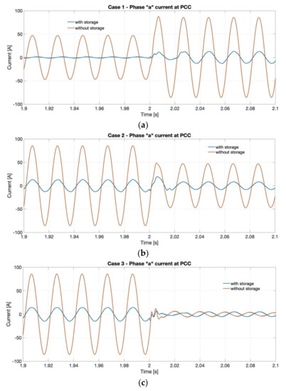 In the following, the behavior at the PCC is analyzed in terms of current and voltage frequency response in the three simulation scenarios. According to Figure 9 (single phase current is depicted, given that the network is considered balanced among the three phases), it is noticeable that the HESS coupling introduces, because of the additional converters, a slightly longer current transient. However, as already mentioned for the power exchanges (Figure 8), the steady state value is reduced, the HESS enabling a smoother response to the sudden change in the wave produced power.