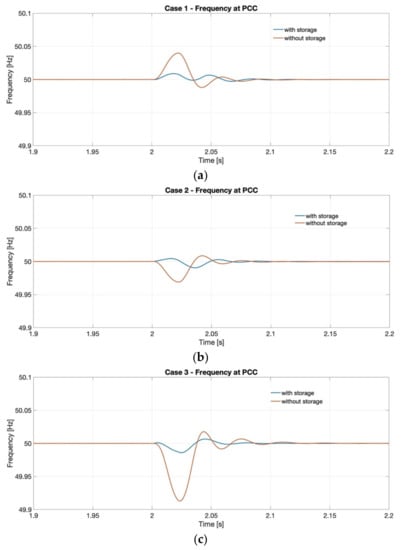 Frequency behavior at PCC: (a) Case 1, (b) Case 2 and (c) Case 3.